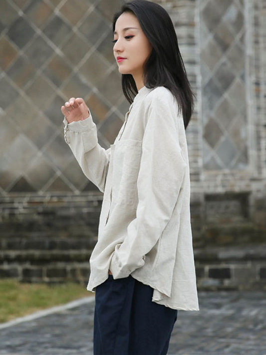 Vintage Ramie Cotton Solid Color Long Sleeve Blouse