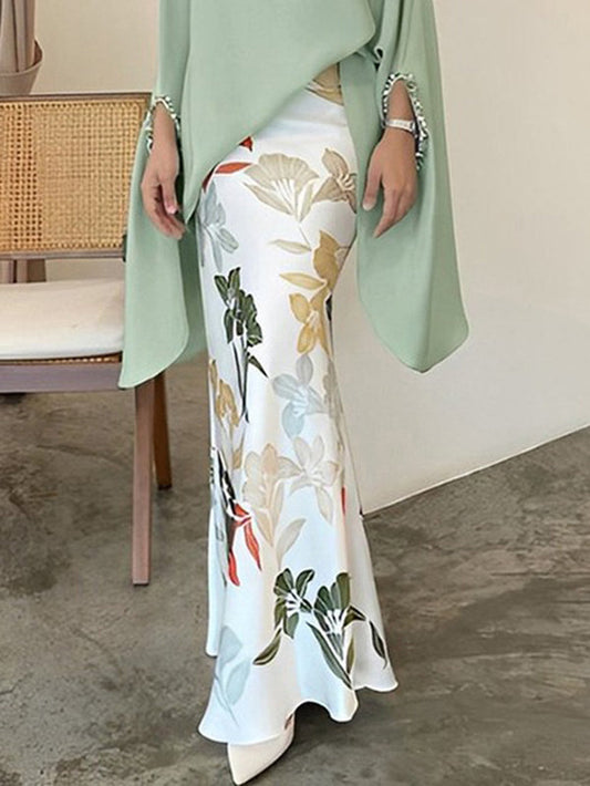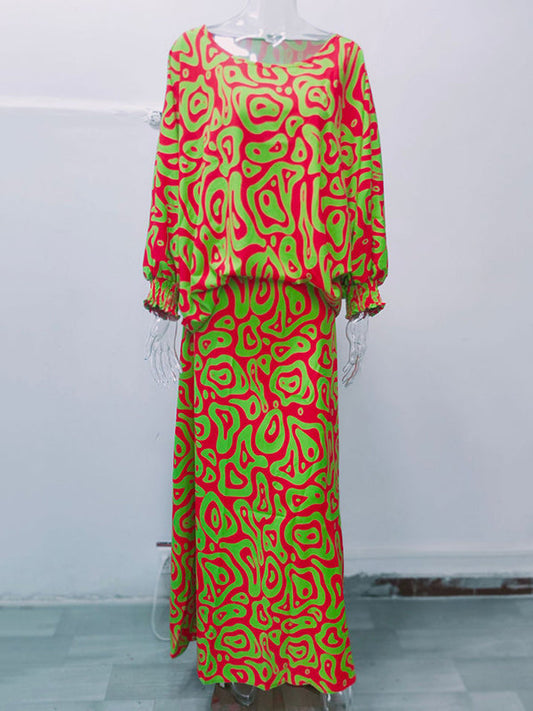 Loose Contrast Color Floral Printed T-Shirt Top&Skirt 2 Pieces Set