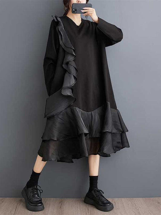 A-Line Long Sleeves Contrast Color Pockets Ruffle Trim Split-Joint V-Neck Midi Dresses