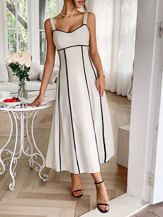 A-Line High Waisted Contrast Color Zipper Spaghetti-Neck Midi Dresses
