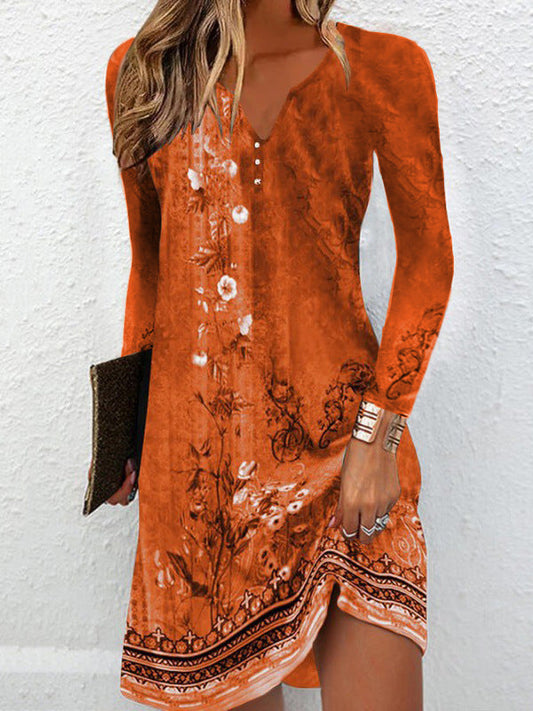 Long Sleeves Loose Floral Printed V-Neck Mini Dresses