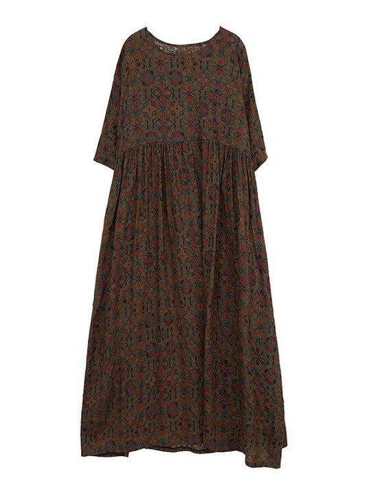 Vacation Loose Half Sleeves Floral Printed Pleated Round-Neck Midi Dresses