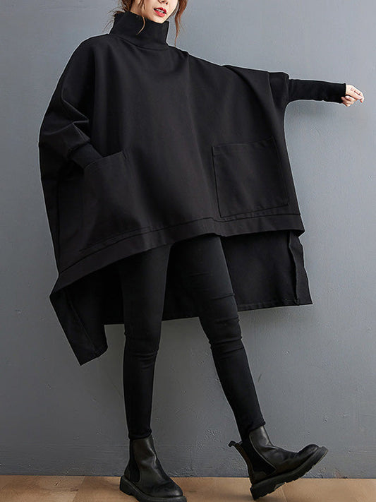 Batwing Sleeves Loose Buttoned Pockets Solid Color Zipper Mock Neck Sweatshirt Tops