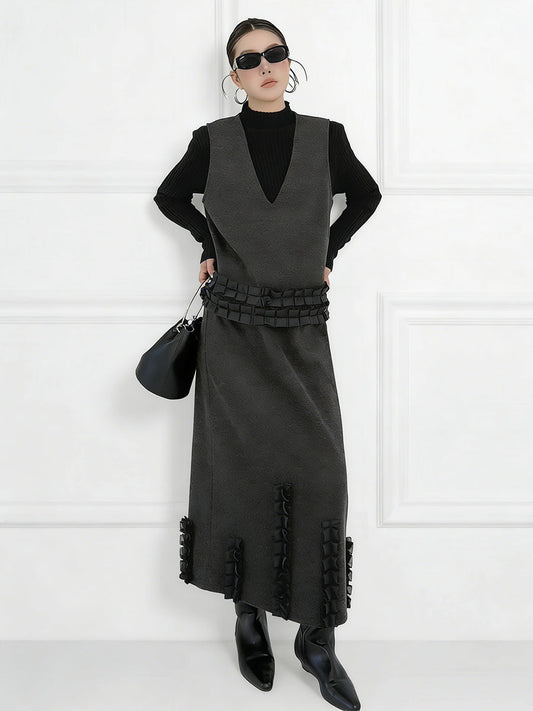 Contrast Color Ruffled Split-Joint V-Neck Vest Top + Elasticated Waist High Waisted Pleated Skirts Bottoms Two Pieces Set