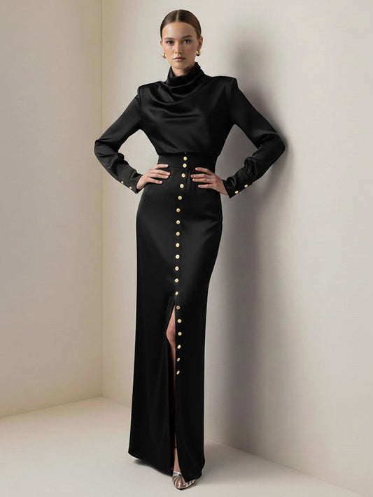 Split-Joint Heaps Collar Long Sleeves Pleated Blouses&Shirts Tops + Elasticated Waist Asymmetric Buttoned Contrast Color Split-Side Zipper Skirts Bottoms Two Pieces Set