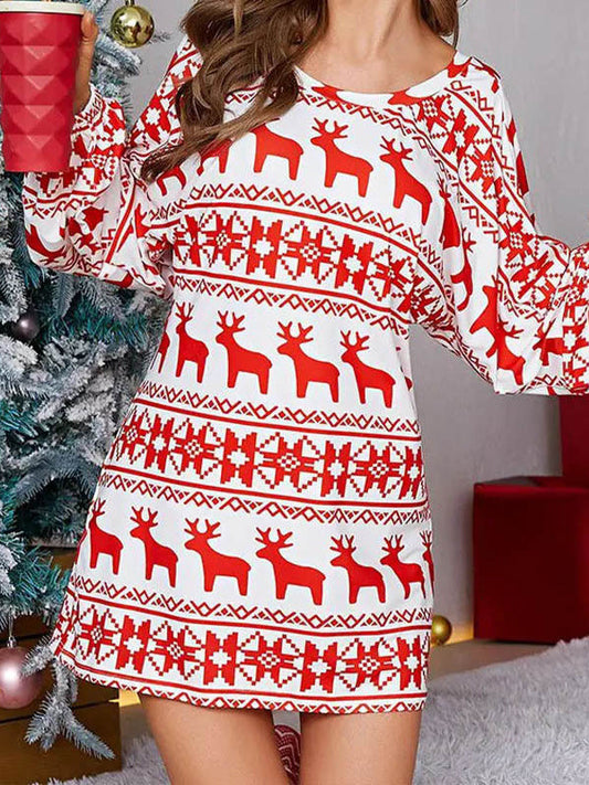 Long Sleeves Loose Flower Print Pleated Round-Neck Mini Dresses