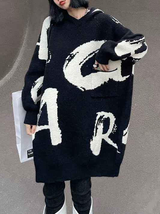 Long Sleeves Loose Knitted Letters Pockets Hooded Mini Dresses Sweater Dresses