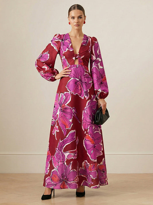 Elasticated Waist Long Sleeves Contrast Color Flower Print Hollow Split-Joint Twist Deep V-Neck Maxi Dresses