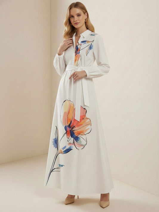 A-Line Elasticated Waist Contrast Color Flower Print Pleated Split-Joint Tied Waist Lapel Maxi Dresses Shirt Dress