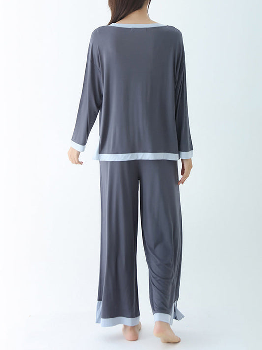Long Sleeves Loose Contrast Color Round-Neck Two Pieces Pajama Set
