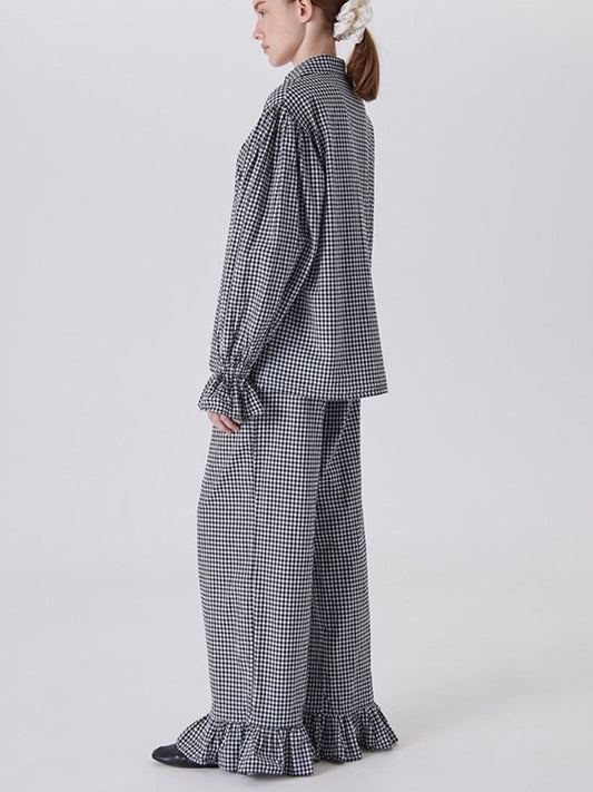 Loose Contrast Color Plaid Ruffled Split-Joint Long Sleeves Buttoned Lapel Blouses&Shirts Tops + Pants Two Pieces Set