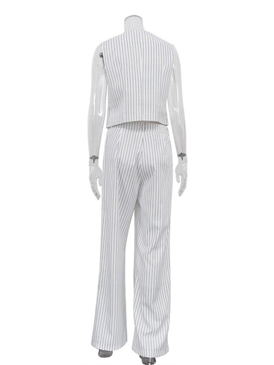 Loose Sleeveless Buttoned Striped V-Neck Vest Top + Pockets Pants Bottom Two Pieces Set