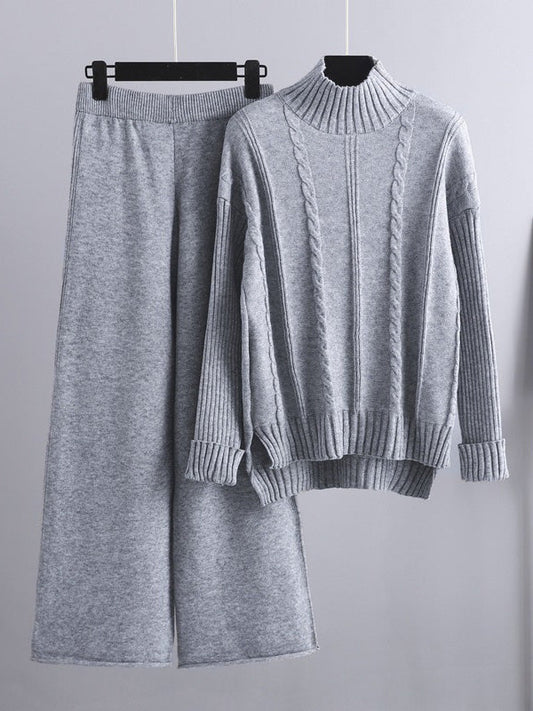 Loose Long Sleeves Split-Side Solid High-Low Half Turtleneck Sweater Tops & Wide Leg Pants Two Pieces Set