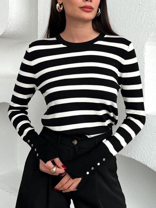 Long Sleeves Buttoned Contrast Color Striped Round-Neck Sweater Tops