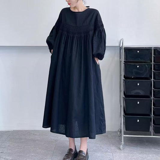 High Waisted Long Sleeves Gauze Pleated Solid Color Split-Joint Round-Neck Maxi Dresses