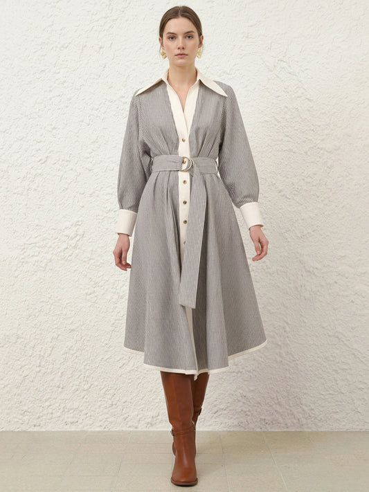 A-Line Elasticated Waist Belted Buttoned Contrast Color Split-Side Striped Lapel Midi Dresses