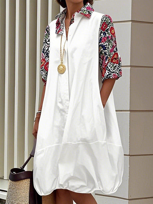 Long Sleeves Loose Buttoned Contrast Color Pleated Pockets Printed Lapel Midi Dresses