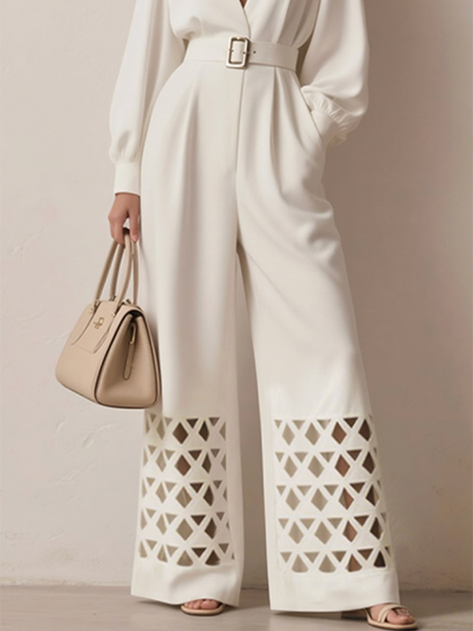 Long Sleeves Puff Sleeves Belted Hollow Solid Color Deep V-Neck Jumpsuits