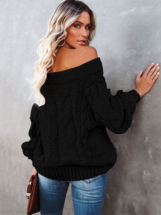 Vintage Long Sleeves Loose Solid Color Off-The-Shoulder Sweater Tops