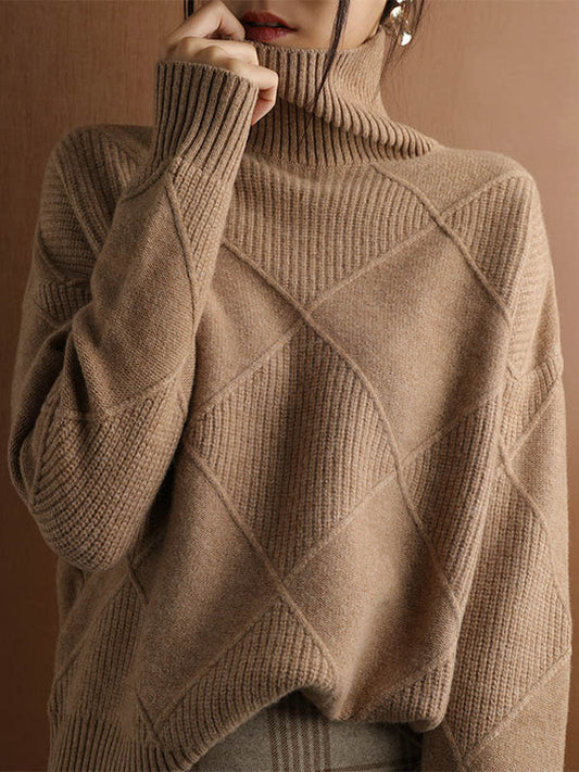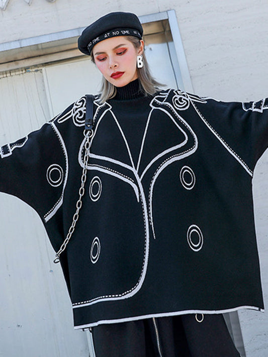 Casual Loose Long Sleeves Contrast Color Jacquard High-Neck Sweater Tops