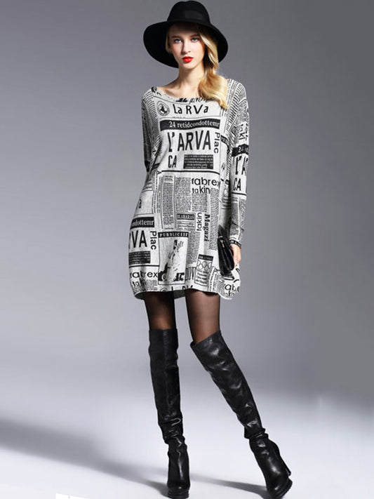 Vintage Loose One-Shoulder Newspaper Printed Split-Joint Sweater