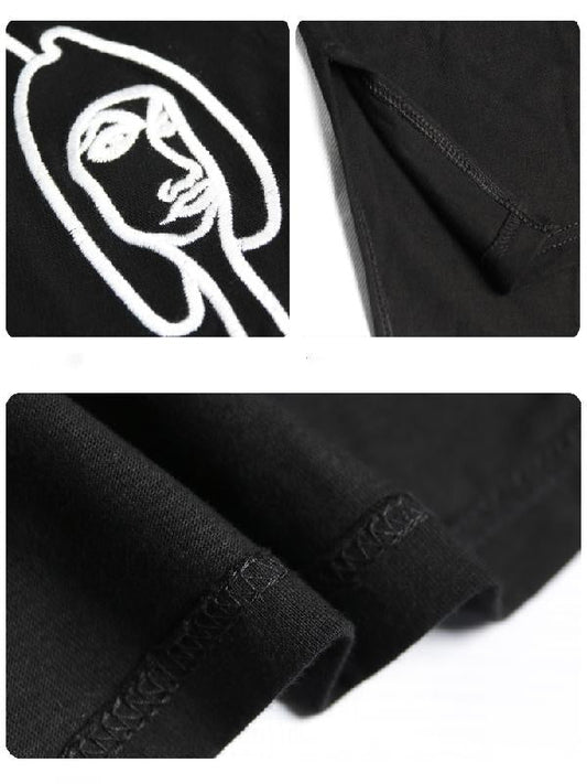 Embroidered Black&White Loose Round-Neck T-Shirt