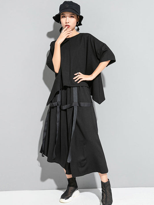 Loose Pleated Solid Color High-Low Round-Neck T-Shirts + Pants Two Pieces Set