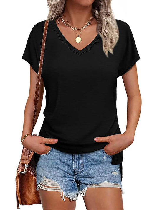 Short Sleeves Solid Color Split-Joint V-Neck T-Shirts