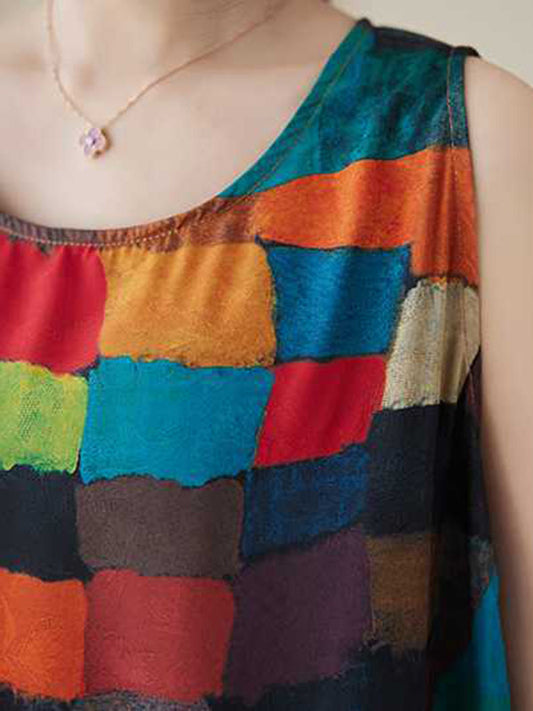 Loose Sleeveless Contrast Color Multi-Colored Plaid Round-Neck Midi Dresses