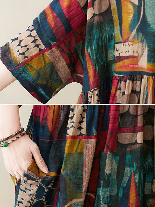 Vintage Loose Abstract Printed Pleated Round-Neck Half Sleeves Midi Dress