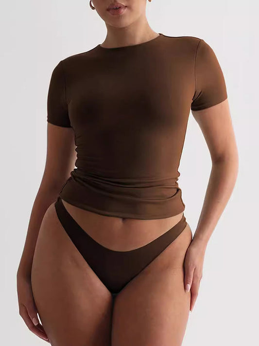 Kurzärmlige, schmale, einfarbige T-Shirts mit geteiltem Schnitt und Rundhalsausschnitt