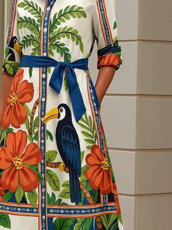 A-Linie, lange Ärmel, geknöpft, Kontrastfarbe, Blumendruck, Taschen, gebundene Taille, Revers, Midi-Kleid