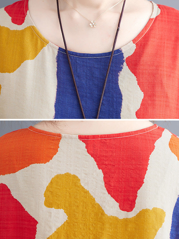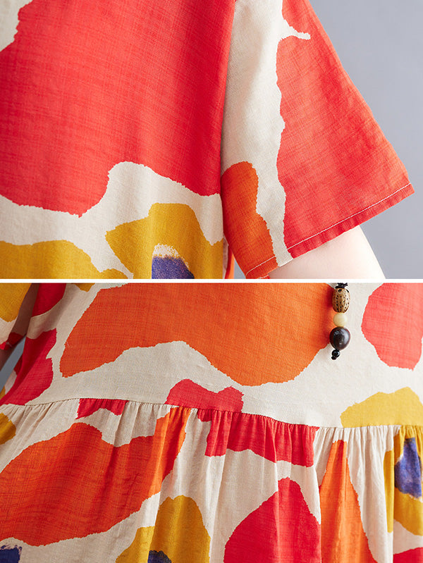 Künstlerische Retro-Kurzarm-Midikleider mit lockerem Kontrastfarbdruck und Rundhalsausschnitt