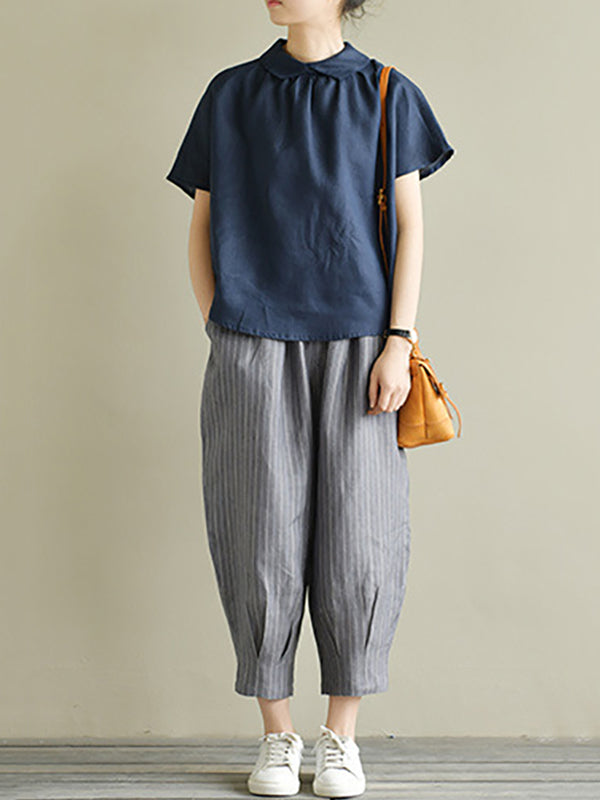 Künstlerische Retro-Blusen und Hemden mit kurzen Ärmeln, locker, plissiert, einfarbig