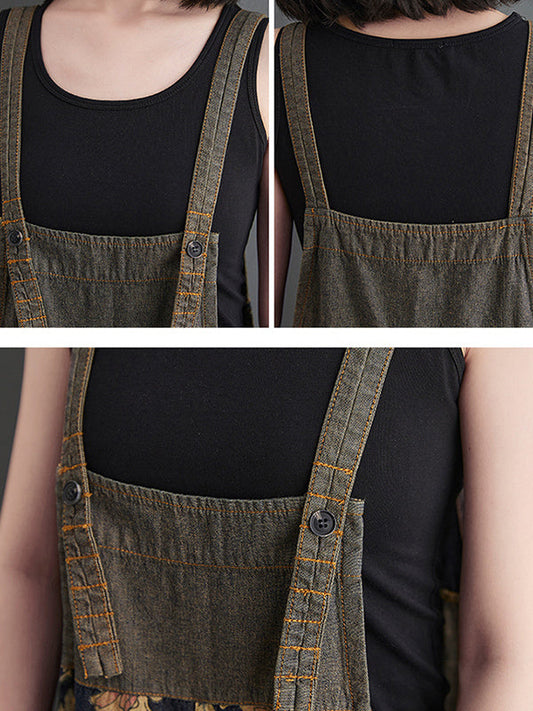 Artistic Retro Vintage Loose Floral Printed Square-Neck Sleeveless Overalls