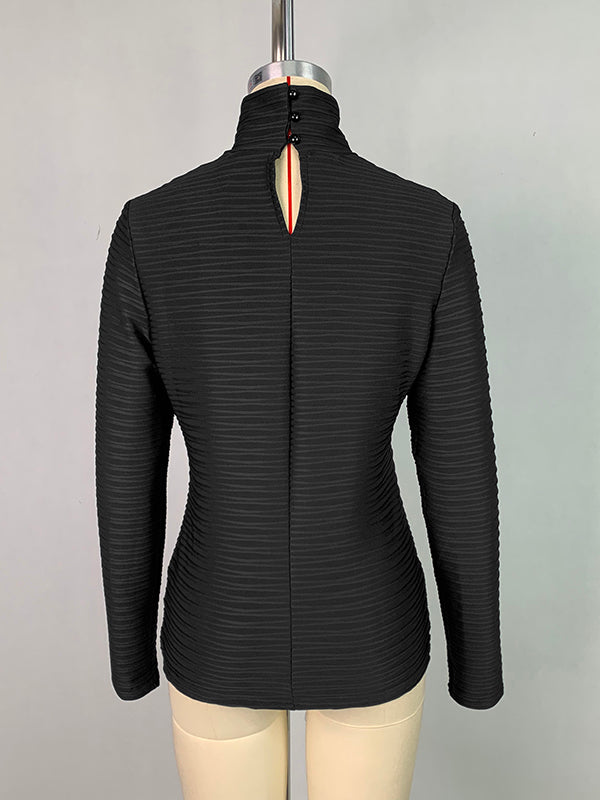 Long Sleeves Skinny Pleated Solid Color Split-Joint High Neck T-Shirts