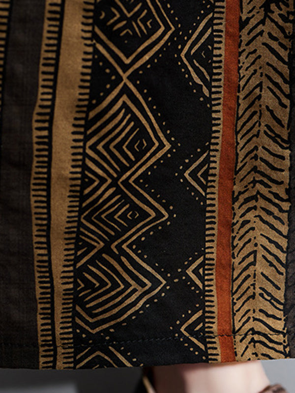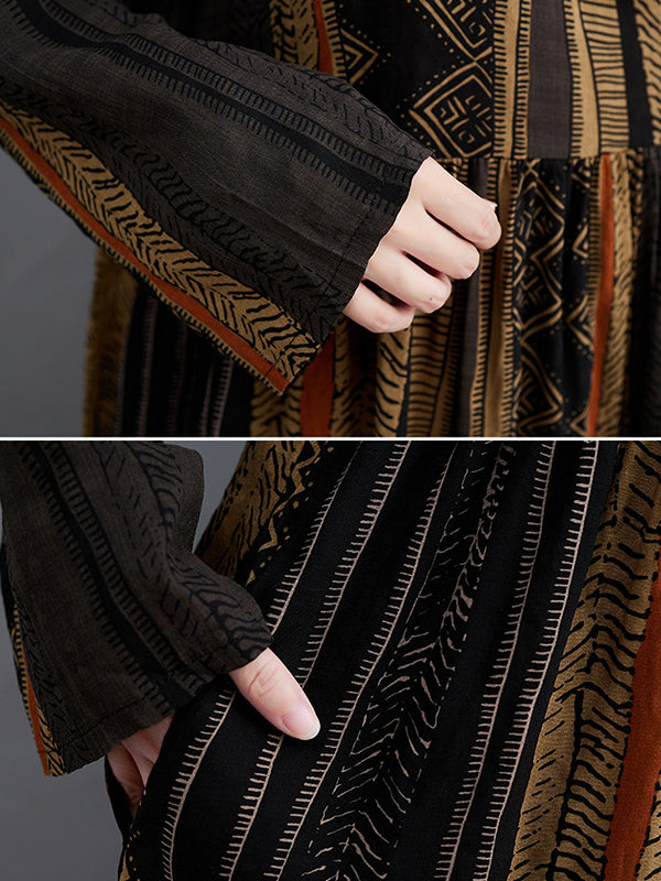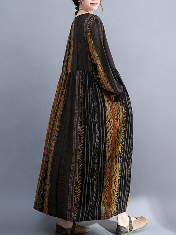 Vacation Loose Long Sleeves Contrast Color Printed Round-Neck Midi Dresses