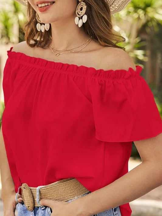 Chemisiers et chemises amples à manches courtes et volants élastiques, couleur unie, épaules dénudées