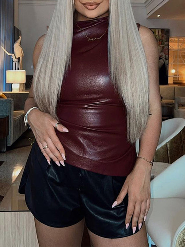Haut moulant sans manches asymétrique plissé de couleur unie à col montant