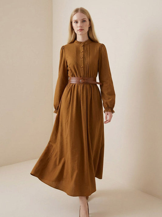 A-Line High Waisted Buttoned Pleated Solid Color Stand Collar Maxi Dresses