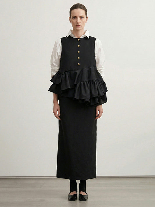 Column Irregularity Asymmetric Buttoned Contrast Color Layered Ruffled Split-Joint Lapel Maxi Dresses Shirt Dress