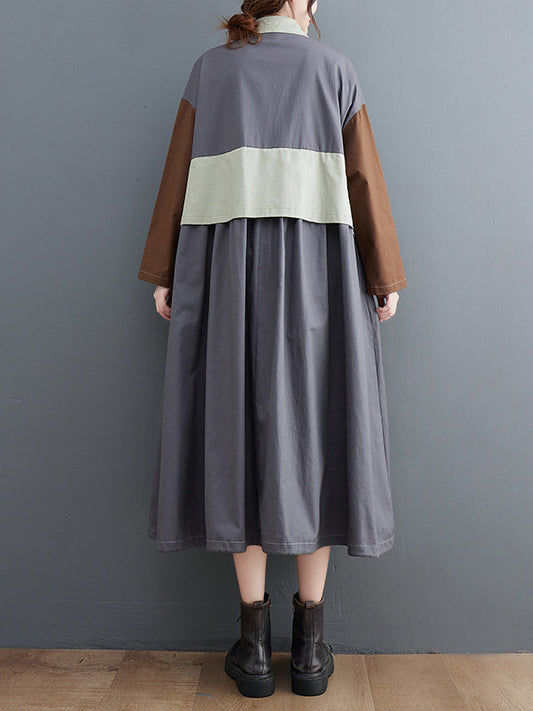 Vintage Loose Long Sleeves Contrast Color Polo Midi Dresses