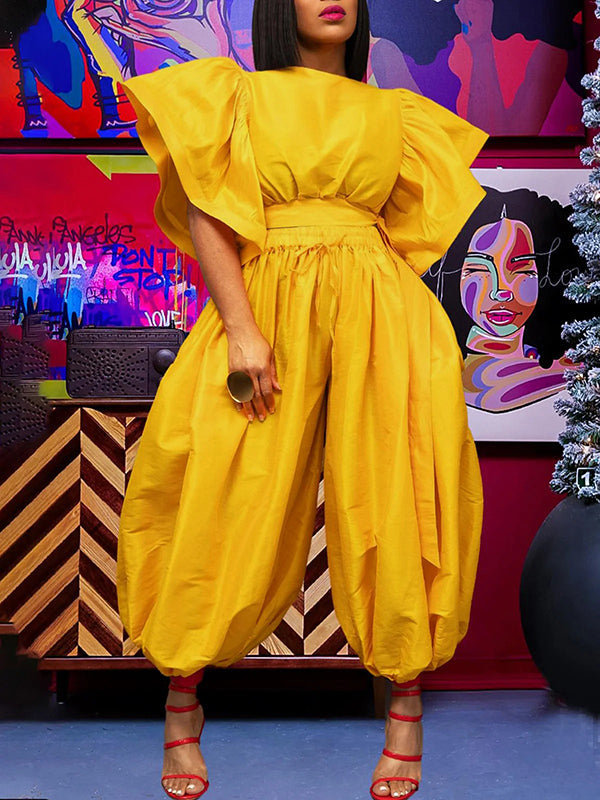 Flying Sleeves Loose Pleated Solid Color Split-Joint Round-Neck Blouses&Shirts Tops