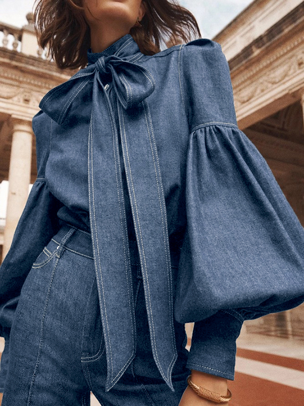 Long Sleeves Puff Sleeves Bow-Embellished Buttoned Split-Joint Tied High Neck Blouses&Shirts Tops