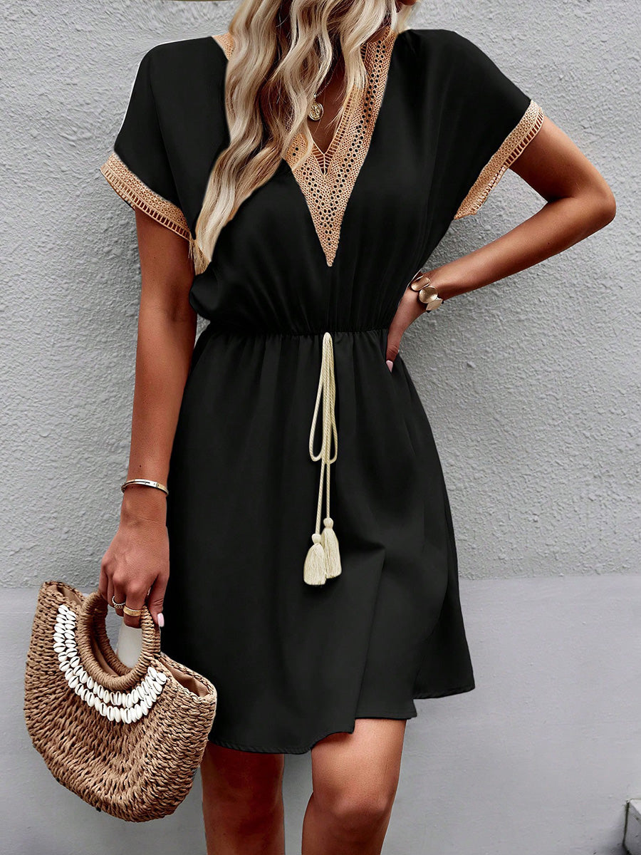 A-Line Elasticated Waist Contrast Color Drawstring Hollow Split-Joint Tasseled Tied V-Neck Mini Dresses