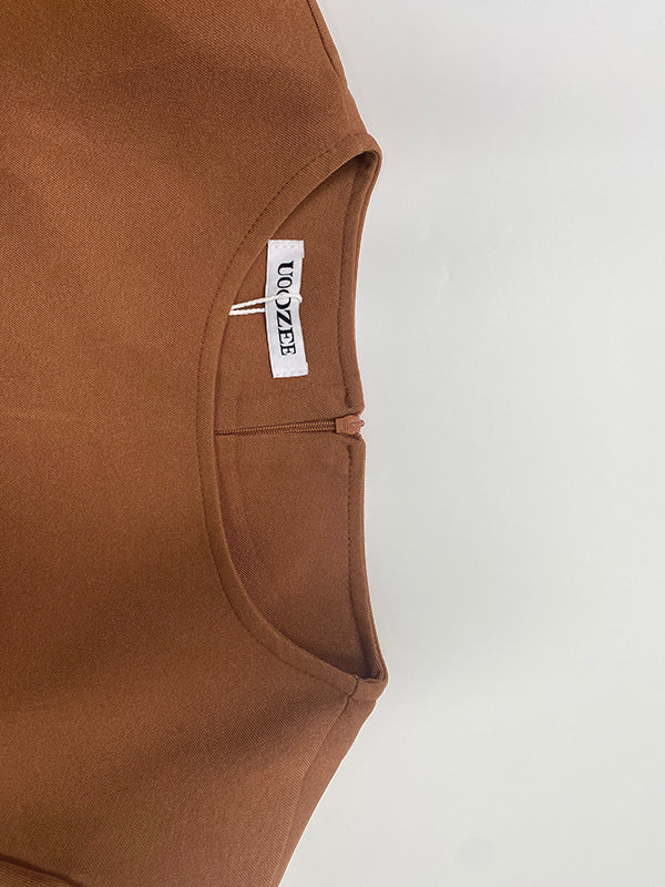 A-Line Long Sleeves Contrast Color Pleated Pockets Split-Joint High Neck Midi Dresses