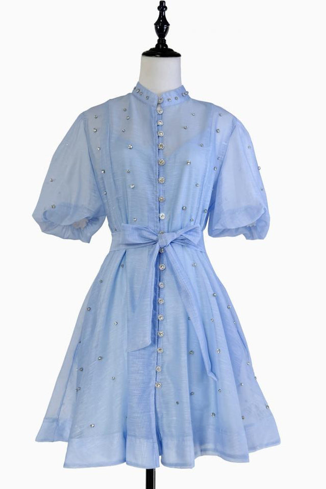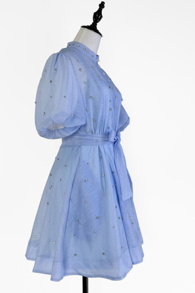 Crystal Embellishment, High Neck, Short Puff Sleeves, Side pockets, Tied Waist, All-over Floral Print, Mini Length.