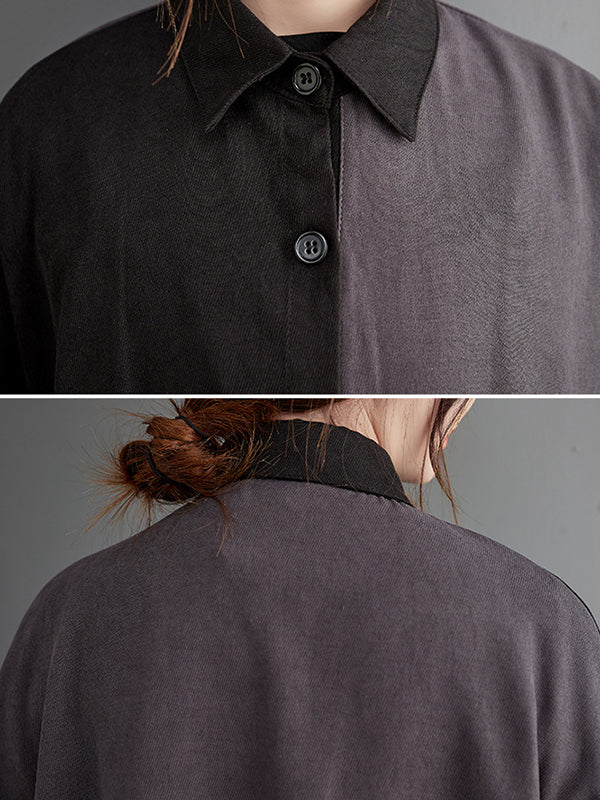 Casual Long Sleeves Loose Buttoned Contrast Color Split-Joint Lapel Collar Midi Dresses
