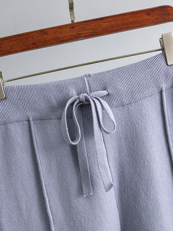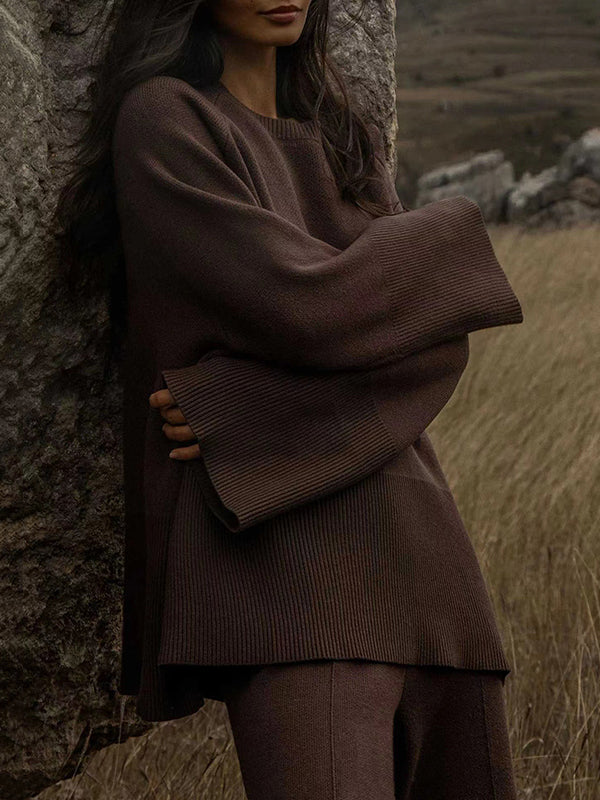 Casual Long Sleeves Loose Solid Color Round-Neck Sweater Tops & Wide Leg Pants Two Pieces Set