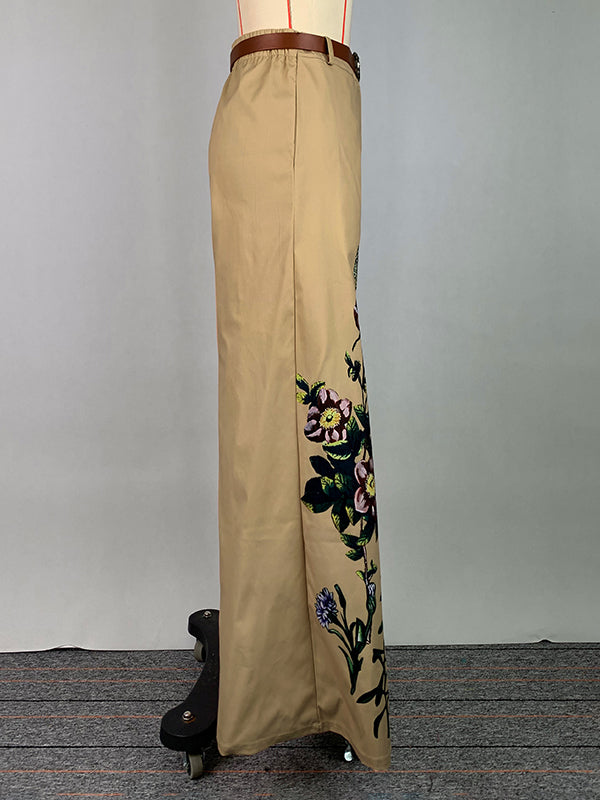 High Waisted Loose Belted Flower Print Pockets Pants Trousers